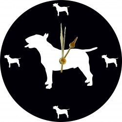 Acrylic clock with Bull Terrier cut out and small Bull Terrier cut-outs at 12, 3, 6 and 9. Available with a black background and white face or white background with black face. Each clock is 250mm diameter and 6mm thick. Lovely unique item ideal for any home or a gift. Each item comes with a protective film that needs to be removed before use.