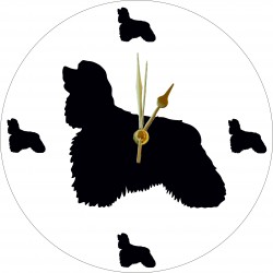 Acrylic clock with American Cocker Spaniel cut out and small American Cocker Spaniel cut-outs at 12, 3, 6 and 9. Available with a black background and white face or white background with black face. Each clock is 250mm diameter and 6mm thick. Lovely unique item ideal for any home or a gift. Each item comes with a protective film that needs to be removed...