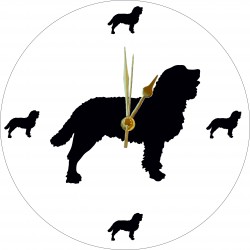 Acrylic clock with Clumber Spaniel cut out and small Clumber Spaniel cut-outs at 12, 3, 6 and 9. Available with a black background and white face or white background with black face. Each clock is 250mm diameter and 6mm thick. Lovely unique item ideal for any home or a gift. Each item comes with a protective film that needs to be removed before use.