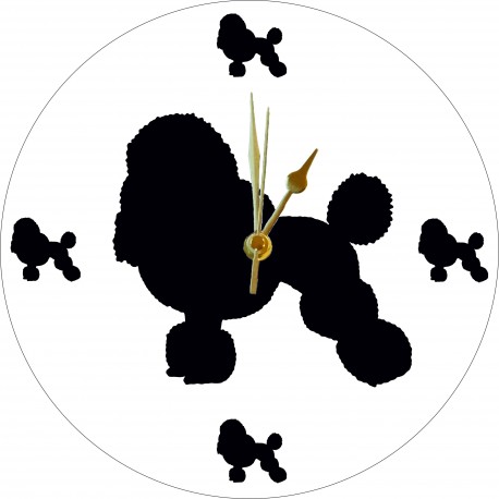 Acrylic clock with Minature Poodle cut out and small Minature Poodle cut-outs at 12, 3, 6 and 9. Available with a black background and white face or white background with black face. Each clock is 250mm diameter and 6mm thick. Lovely unique item ideal for any home or a gift. Each item comes with a protective film that needs to be removed before use.
