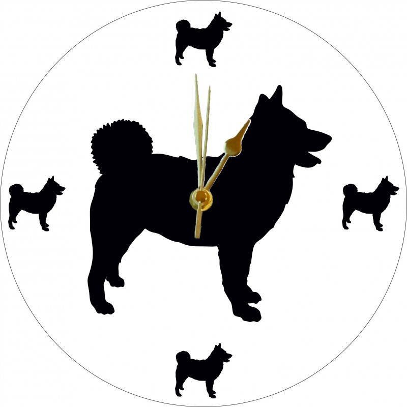Acrylic clock with Norweigan Elkhound cut out and small Norweigan Elkhound cut-outs at 12, 3, 6 and 9. Available with a black background and white face or white background with black face. Each clock is 250mm diameter and 6mm thick. Lovely unique item ideal for any home or a gift. Each item comes with a protective film that needs to be removed before use.