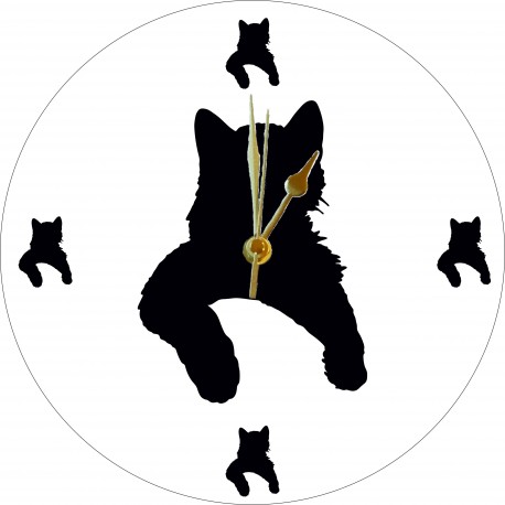 Acrylic clock with Cat cut out and small Cat cut-outs at 12, 3, 6 and 9. Available with a black background and white face or white background with black face. Each clock is 250mm diameter and 6mm thick. Lovely unique item ideal for any home or a gift. Each item comes with a protective film that needs to be removed before use.
