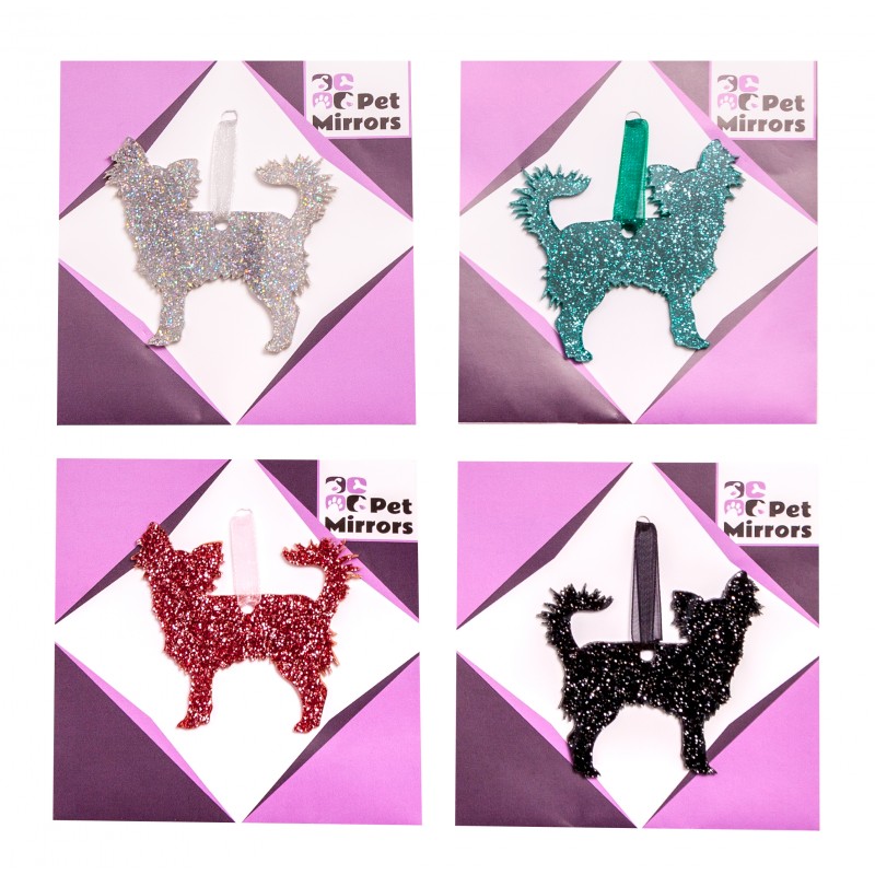 3mm thick silver acrylic mirror Christmas decoration, laser cut in the shape of a Chihuahua. Makes a fun, inexpensive addition to the home or garden at Christmas time. Shatterproof material which is lighter and 10 times stronger than glass. All the edges are laser polished. Each acrylic mirror comes with a protective film that needs to be removed before use. Each Christmas decoration is 100mm (10cm) wide. These decorations are only mirrored and one side and come complete with a hanging loop.